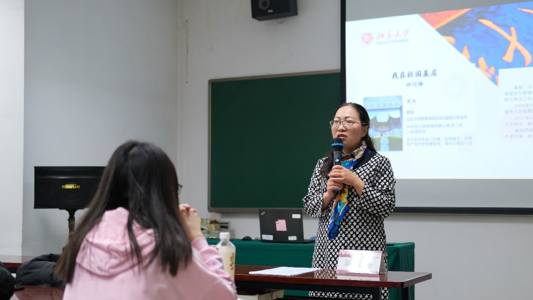 随后,选调生嘉宾依次分享了她们的工作体会。黄丽结合近年来从事选调生招录、培养的工作经历,为同学们总结了选调生的发展历史、选择地方选调的求职理由和选调生所需具备的重要能力。她谈到,讲政治的“红”、懂业务的“专”、炼心志的“忍”和巧表现的“说”是选调生在工作岗位上应具备的四大能力,只有政治过硬、能力过人、善于沟通、吃苦耐劳才能及时把握机会,出类拔萃。她强调,选调生背靠组织,深入基层,能够切实地通过自己的工作为人民群众的生活带来改变与益处,真正实现在祖国建功立业。