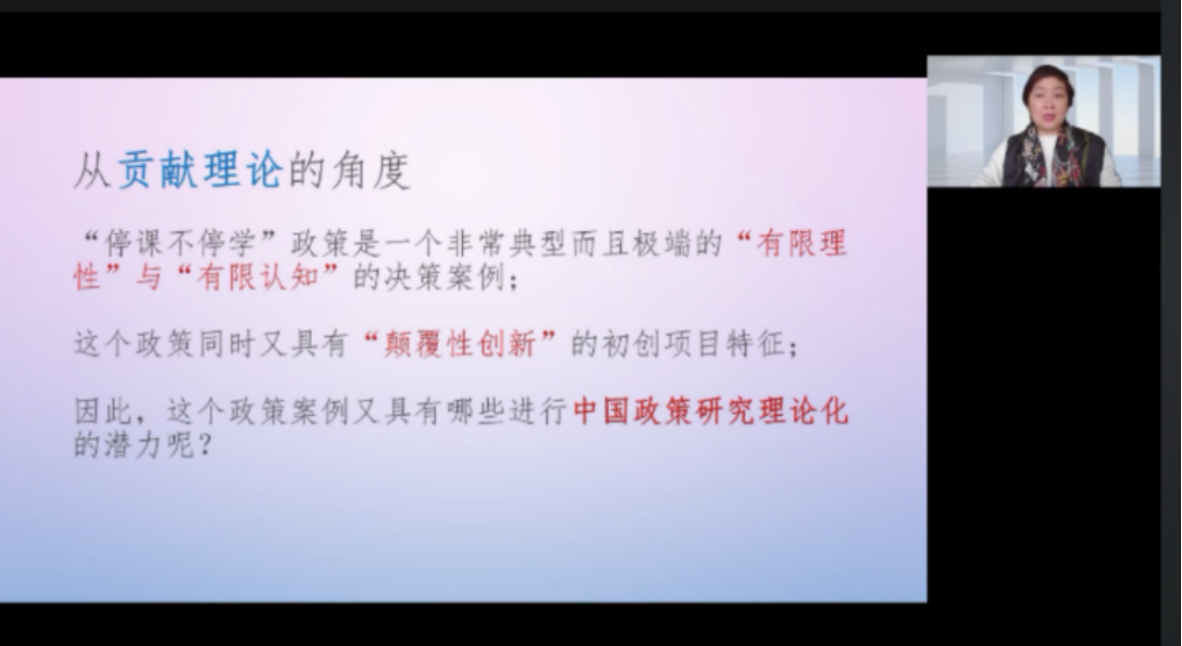 华东师范大学课程所副所长陈霜叶以非常态中的中国教育政策常态报告。陈霜叶教授立足于疫情的非常态状况,透视其中教育的常态,分析中国的政策现实的知识基础。陈霜叶教授以去年两个多月中国全域的“停课不停学”政策任务为切口,探析这一项不可能的任务是如何在国家的政策中成为可能、从颠覆性的目标变成现实的;其中又有哪些默会的知识。陈霜叶教授梳理了疫情期间停课不停学政策的变化过程分析了政策中浮现的“愿景性目标”与“快速政策迭代”和“打补丁”政策。总结指出,近几年,中国教育政策系统中已经形成了一系列本土性政策知识,甚至形成了因应舆情、因地制宜的政策脚本。研究者应该看到中国政策的特点,分析其中的优点和缺点,为之后的教育实践提供经验和教训。