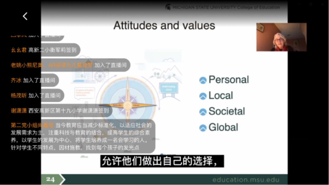密西根州立大学国际教育学院副院长Lynn Paine琳·佩恩K-12教育为主题发表报告。琳·佩恩教授指出,不断变化、更加复杂的世界让人们意识到摆脱教育的旧有框架很重要,教育也必须考虑个人、社区和整个世界的福祉。琳·佩恩通过分析OECD开发面向未来的“学习指南”,提供了教育学习愿景及学习目标。“学习指南”的使命是将知识、技能、价值观和态度融合在一起,帮助学生实现可持续的幸福。琳·佩恩认为,态度、价值、知识并非是相互竞争的零和关系,而是相互依赖、相互关联的。其中,知识不仅包括核心性基础知识,还包括公民意识、公平、个人和社会责任等价值观;技能包括认知和元认知技能、社会和情感技能、新技术和新信息的实践技能琳·佩恩最后指出,对于教育者来说,重塑教育的理念不仅是改变课程,更重要的是要重塑自身对于教学的思考