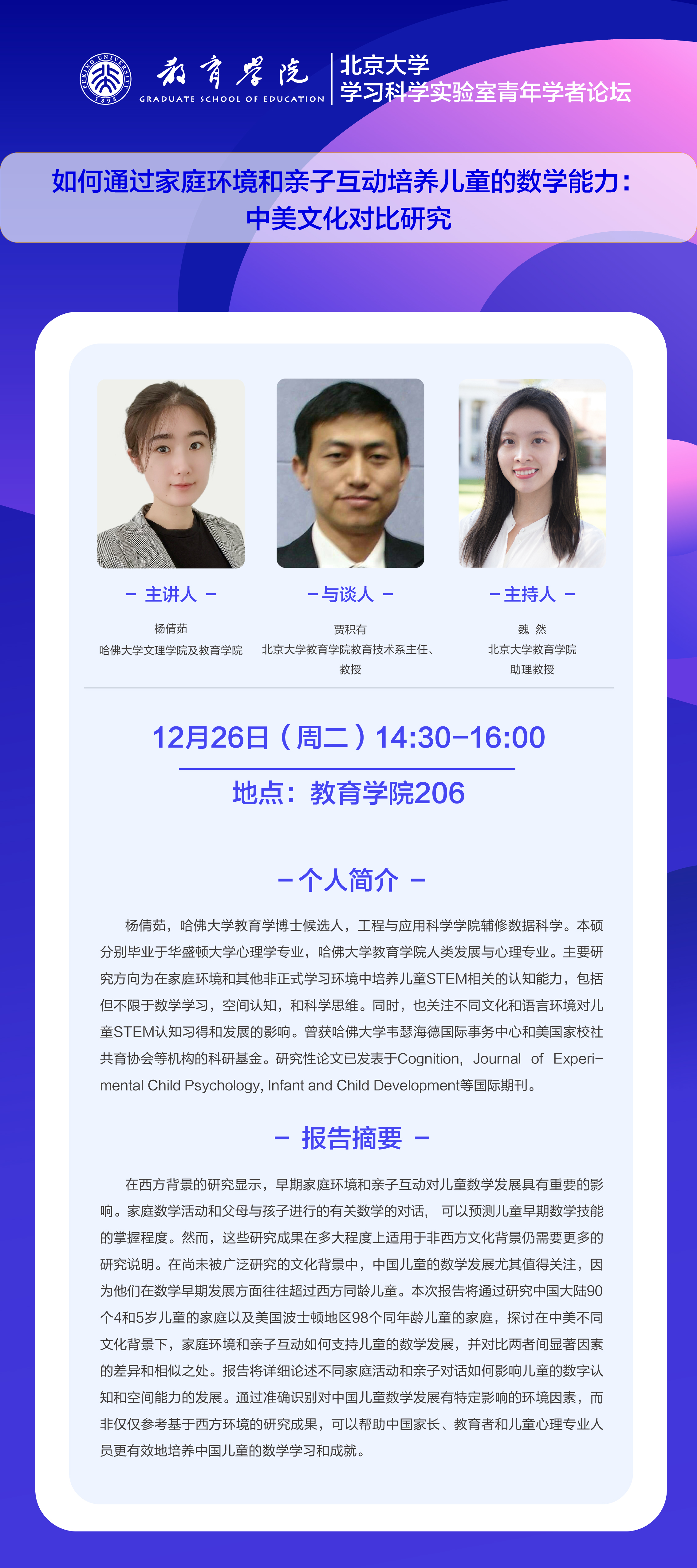 讲座 | 学习科学实验室青年学者论坛:如何通过家庭环境和亲子互动培养儿童的数学能力:中美文化对比研究
