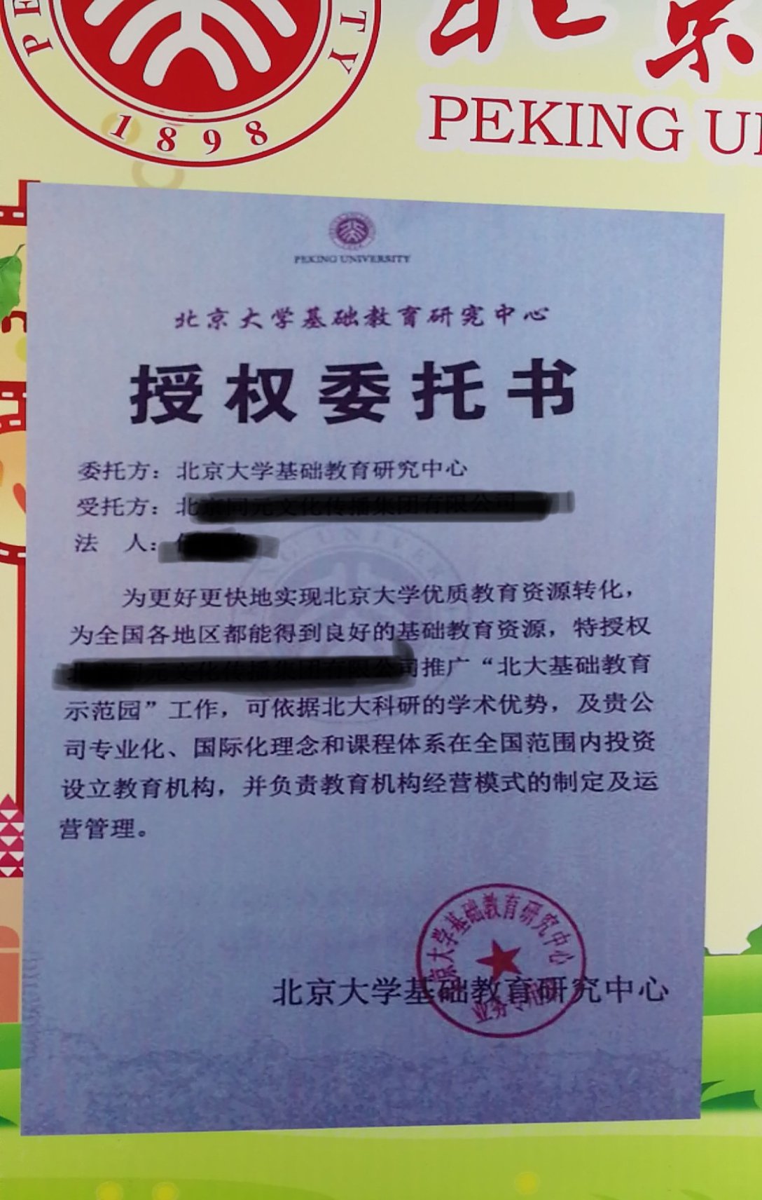 涉嫌伪造的北京大学基础教育研究中心授权委托书(依据有关管理规定,北京大学基础教育研究中心不设公章,凡有“北京大学基础教育研究中心”字样的公章或业务专用章均系伪造)