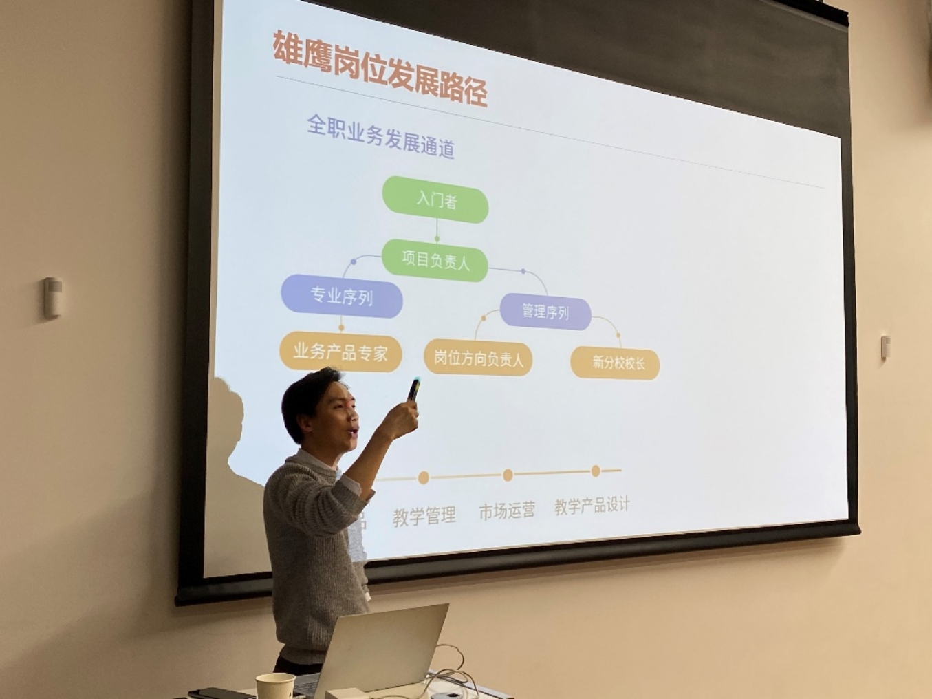 接着,代声贵老师向参访同学介绍了好未来集团旗下的“双师雄鹰管培生”项目,对其教育理念、工作内容、岗位发展路径、岗位需求等进行了详细介绍。同学们就各自关注和感兴趣求职、面试等问题在现场与代老师进行了互动交流,进一步加深了对教培行业头部公司的了解。