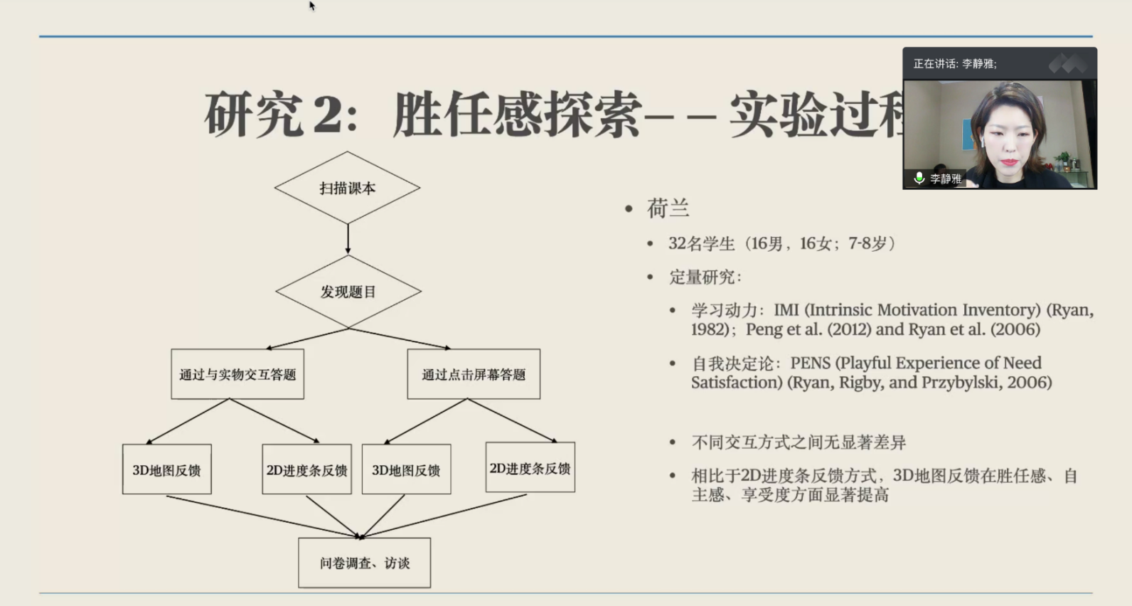 荷兰埃因霍温理工大学博士生在题为《基于增强现实技术的学习社交游戏设计研究》的报告中,介绍了基于自我决定理论设计的增强现实教育游戏的多轮实验研究及其发现。