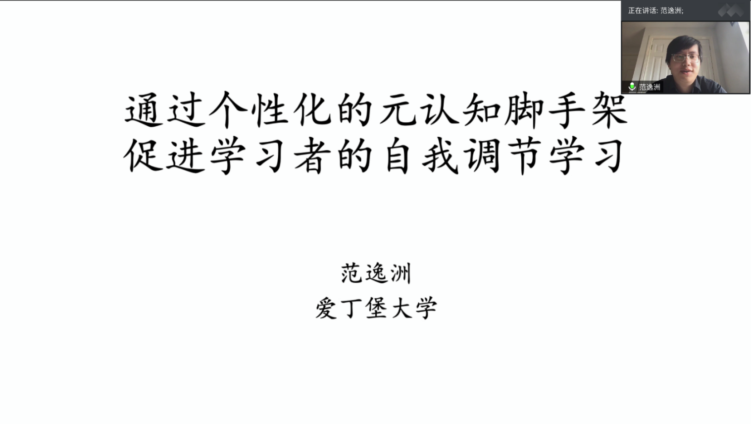 英国爱丁堡大学博士后范逸洲博士的报告题目为《通过个性化的元认知脚手架促进学习者的自我调节学习》。他介绍了通过设计元认知脚手架赋能学生、增进学生自我调节能力的详细方法和效果。