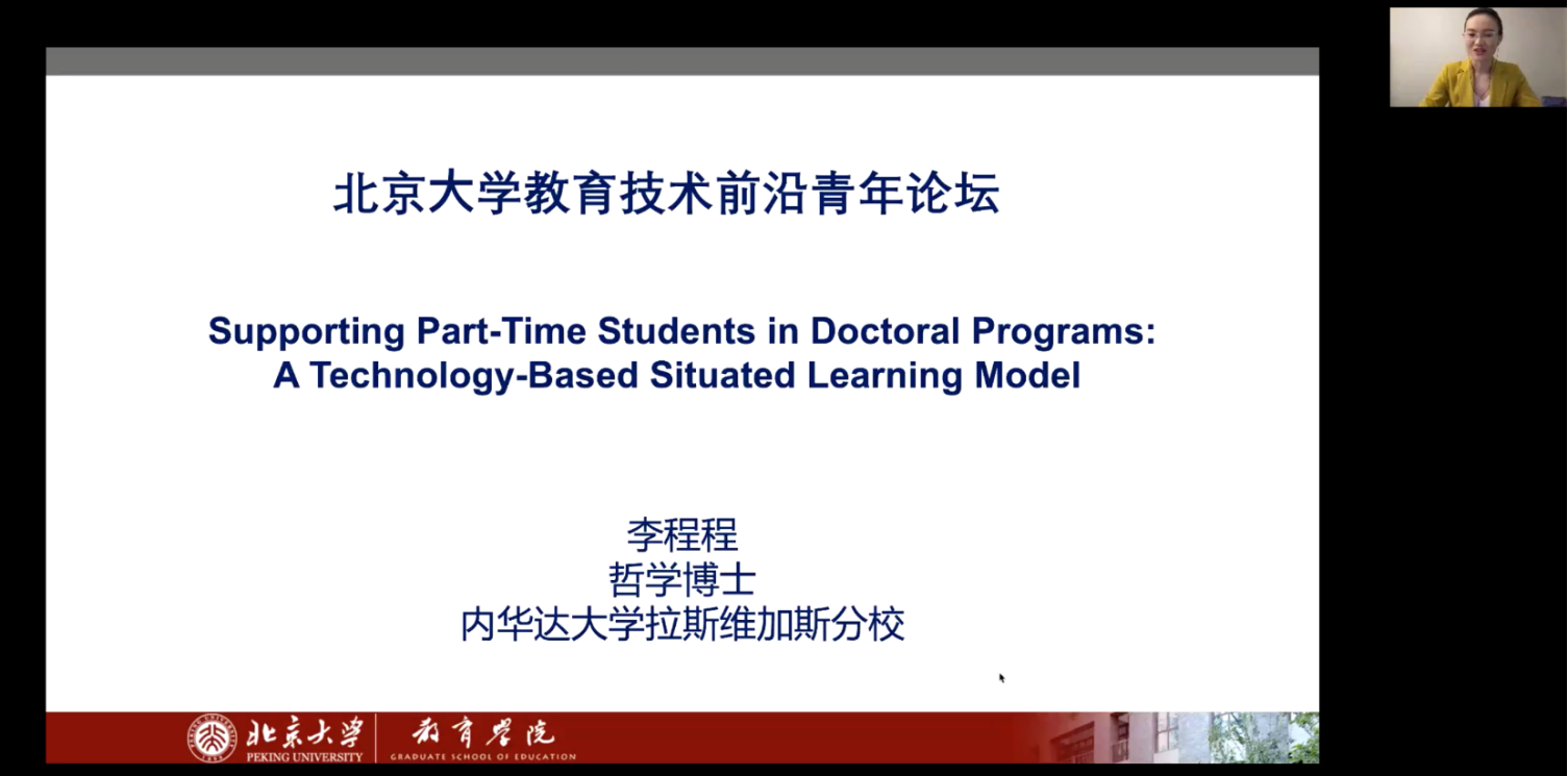 美国内华达大学拉斯维加斯分校博士生李程程作了题为《Supporting Part-Time Students in Doctoral Programs: A Technology-Based Situated Learning Model 》的报告。她分析了全日制博士生和非全日制博士生的学习行为差异,展示了信息技术在博士生培养中的作用。