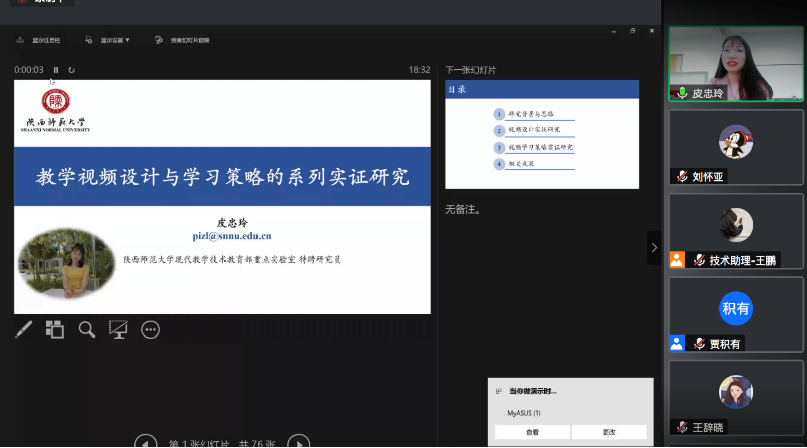 陕西师范大学教育学院青年教师皮忠玲博士的报告题目为《教学视频设计与学习策略的系列实证研究》。她详细介绍了其研究团队在教学视频设计领域的实验研究和发现,包括视频呈现模式、教师位置、手势、引导行为、目光和表情等因素对视频学习效果的影响。