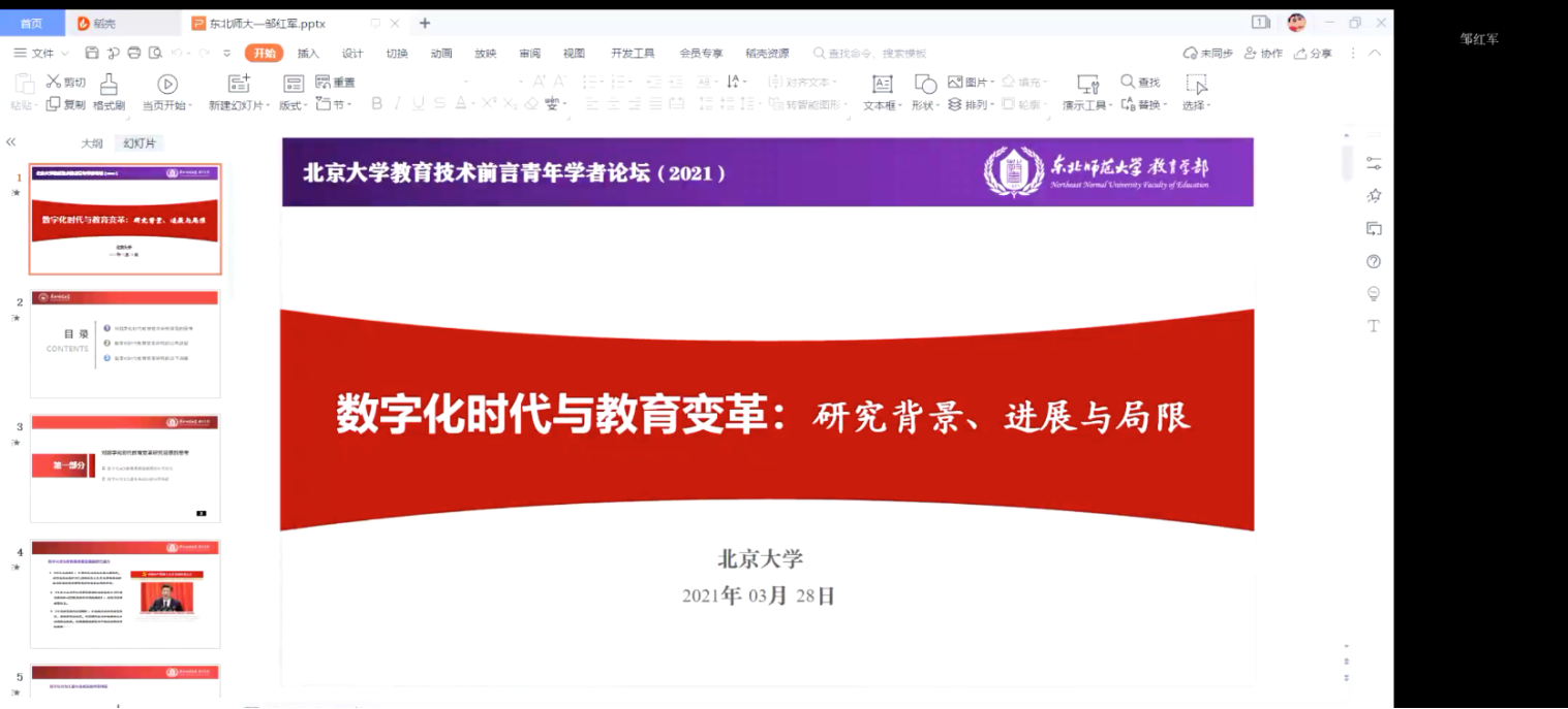 东北师范大学博士生邹红军在题为《数字化时代与教育变革:研究背景、进展与局限》的报告中,从哲学(现象学、认识论)层面深入思考教育技术和教育发展问题,分析了数字化时代可能面临的风险。