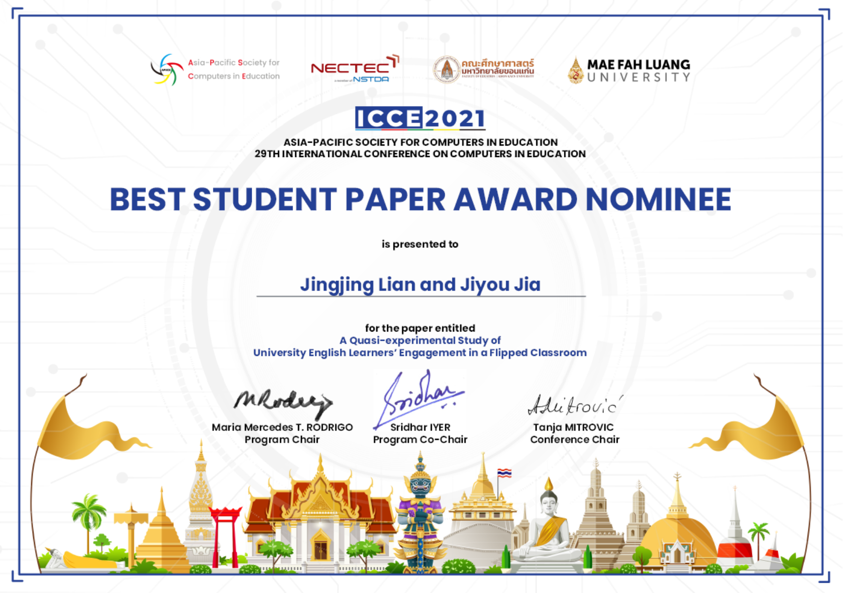 我院EdD博士生连晶晶和导师合作论文荣获ICCE2021最佳论文提名奖和最佳学生论文提名奖
