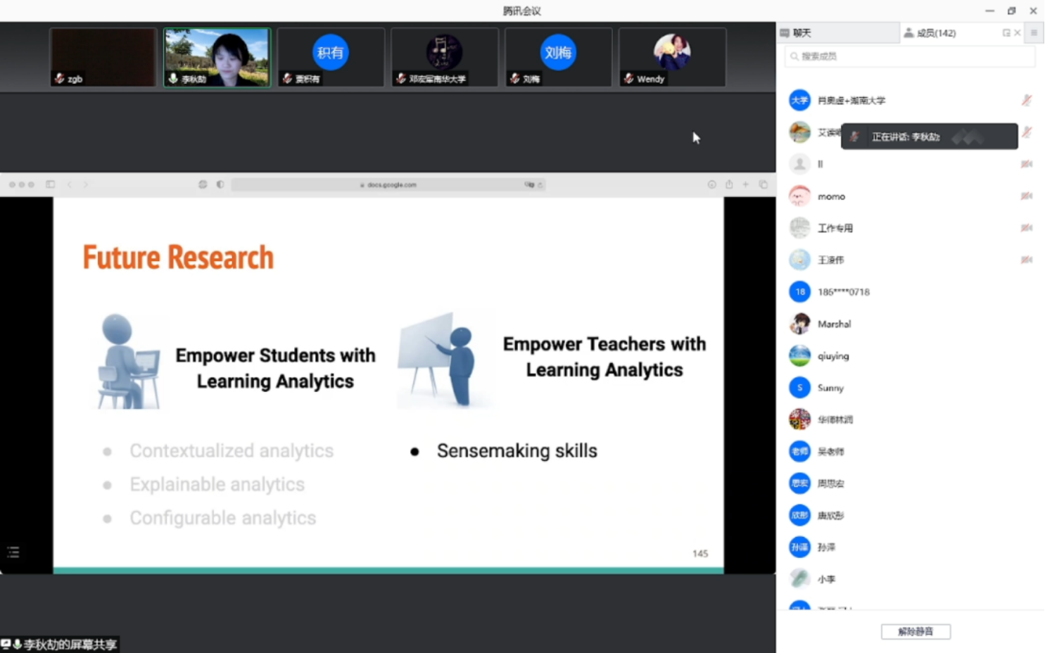北京时间2021年12月21日下午,教育学院关于学习分析的学术讲座在腾讯会议线上举行。报告人是美国加州尔湾大学分校博士后研究员李秋劼博士,讲座停题目是“利用学习分析技术支持在线自主学习(Using Learning Analytics to Support Self-regulated Learning in Online Courses)”。本次讲座由教育技术系主任贾积有教授和北京师范大学教育技术学院院长武法提教授联合主持,我院和来自海内外的150余名师生参与。
