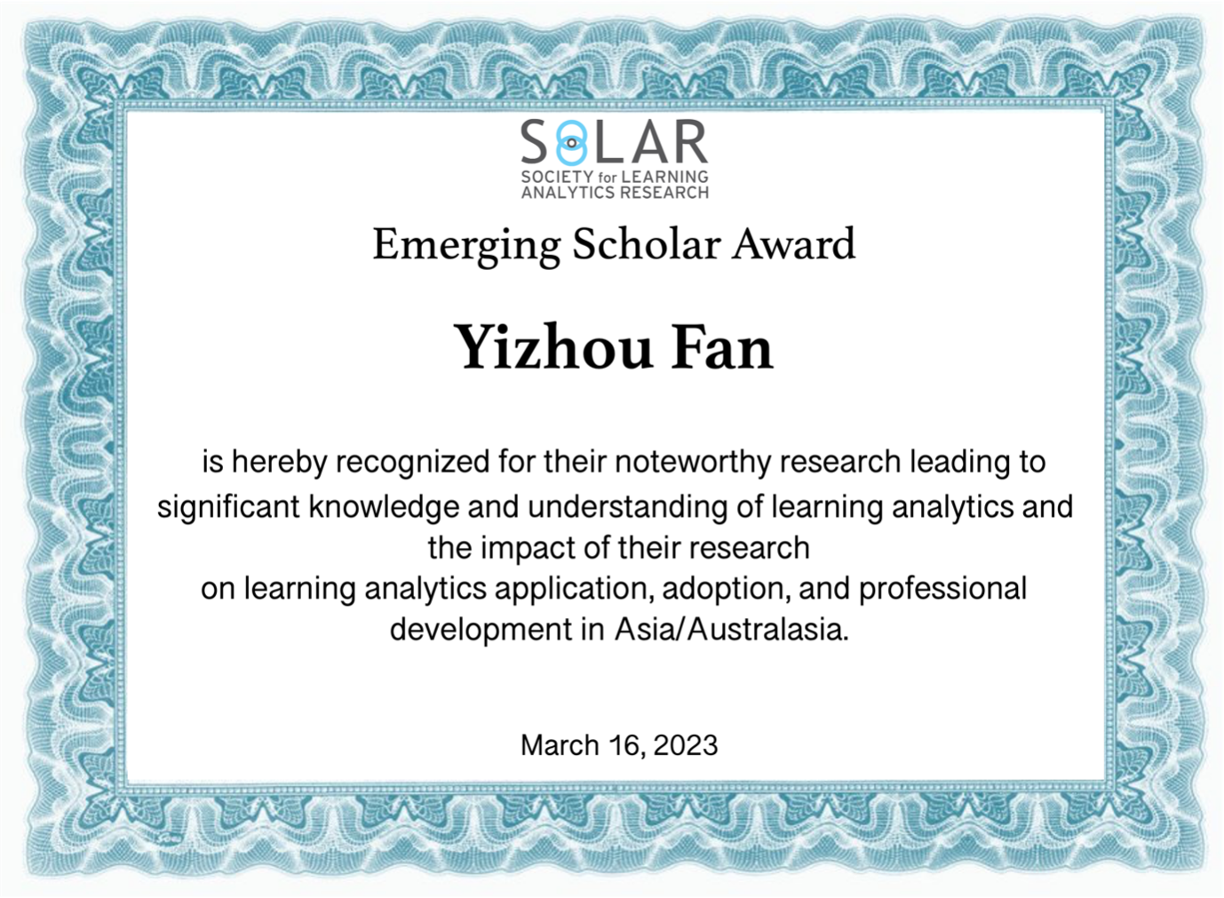 近日,在第十三届国际学习分析与知识年会(LAK23)上,我院教育技术系的范逸洲老师荣获国际学习分析学会颁发的“新锐学者奖”(Emerging Scholar Award),是该奖项在亚洲/大洋洲区域内唯一获奖人。该奖项旨在奖励学习分析领域内为学科发展做出瞩目贡献的青年学者,于2023年设立并首次颁奖,在全球范围内评选并颁发给了三位学者。