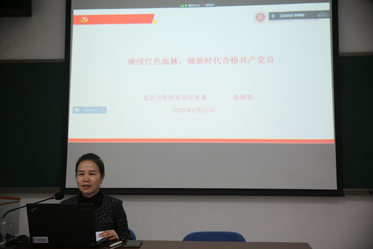 张晓黎书记为培训班学员做了题为《赓续北大红色基因,做新时代合格共产党员》的专题报告。她从北大的红色基因出发,结合北京大学历史上的重要时间节点,带领培训班学员们回顾了北京大学的发展历史,对北京大学与中国共产党的历史渊源和“爱国、进步、民主、科学”的北大精神进行了解读和阐述。她谈到,回顾北京大学的历史和光荣传统,体会北京大学与中国共产党的血肉联系,学习和体会北大精神,就是要从中不断汲取强大的精神动力和不竭力量,继承和保持北京大学的红色基因,始终牢记“为民族谋复兴,为人民谋幸福”的初心使命,坚持北大人胸怀天下、心系国家民族的精神特质。在专题党课的最后,她带领大家重温了习近平总书记在北京大学师生座谈会上的讲话和纪念五四运动100周年的讲话中针对新时代青年提出的六条希望,希望同学们响应时代召唤,做一名合格的优秀的北大人,做一名合格的优秀的共产党员。