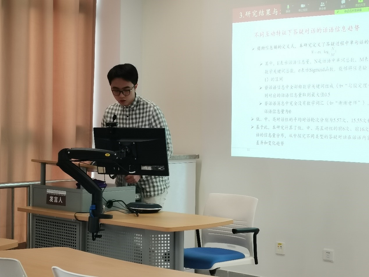 在子会议七“学习分析与学习评估”中,21级硕士生陈昂轩作了题为《课后疑问怎么答?在线情境下师生一对一同步答疑特征分析研究》的报告。该研究基于对话的频次、时长、内容三个维度对一个在线学习系统中的师生在线答疑记录进行聚类,并通过对话语信息量的定义和计算,发现:在线答疑过程师生呈现低、中、高三类不同的对话互动模式,越高的互动状态对应的学生知识点掌握越差;不同类型的互动分别体现了“一点就通”、“步步回应”、“主动讨论”三种师生的答疑序列状态;教师在学生首次答疑时呈现的话语质量能够显著影响学生之后的互动状态。基于以上发现,研究针对教师与在线平台的在线答疑设计给出了建议。