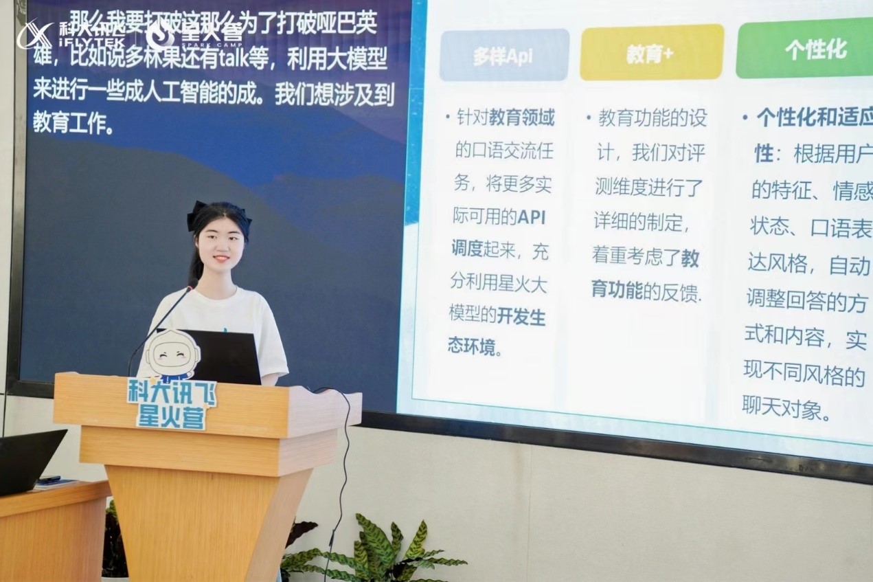 8月19日至24日,分组进行小组实践活动。张誉月所在小组基于讯飞提供的原子能力(星火API、Embedding API、向量检索API)等,搭建了一套多端访问的英语口语对话系统AI Talk。作为一款教育类工程产品,融入众多教育设计元素,能够基于多种指定话题或与用户自由闲聊,并对用户对话内容进行离题检测、完整度检测、语法检错、语音评分、模式选择、虚拟人物选择、难度选择、精准评测、量化分析等功能,让英语学习更高效、更有趣、更轻松,真正实现AI赋能教育。黄柏喻所在小组基于讯飞星火API,开发了民事起诉场景的任务型对话系统AI micus,用户描述案情,及其通过提示或多轮对话,引导用户补充所需信息,最终生成诉状。