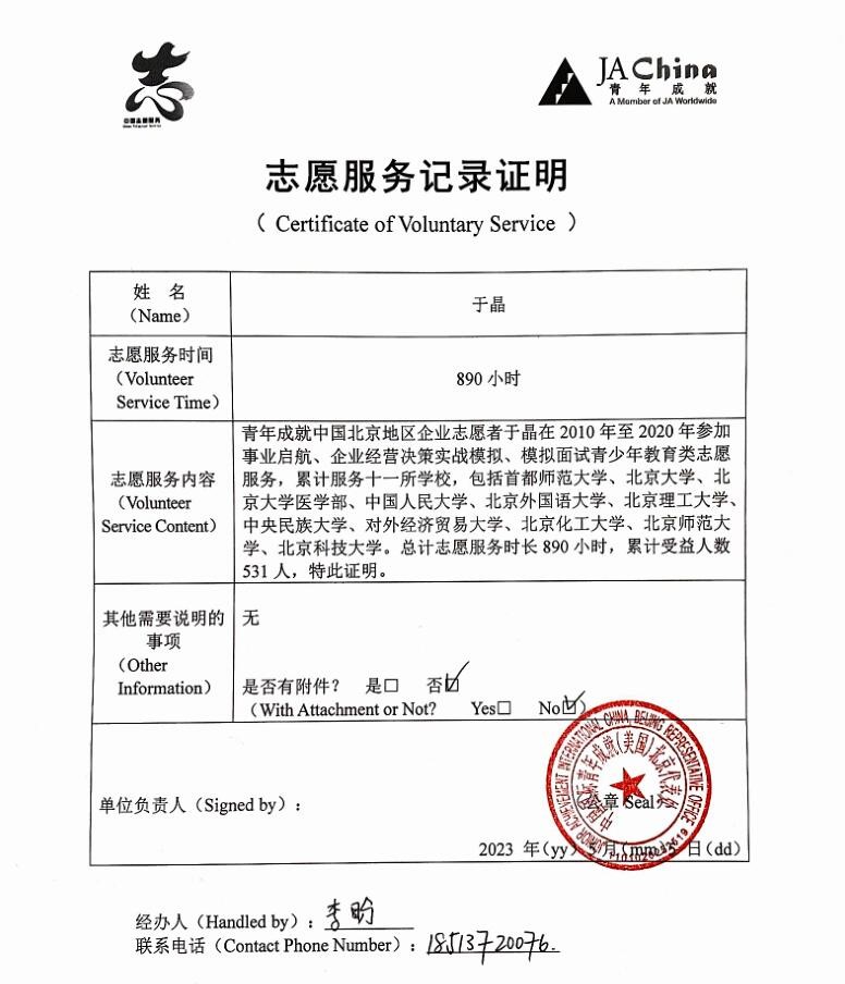 于晶具有奉献精神、强烈的社会服务意识,2010年加入非营利教育机构青年成就,担任企业志愿者,现已坚持10年,志愿服务890小时,走入北京大学等11所高校,为500多名学生讲授“事业启航课程”,帮助其提升就业准备、创业创新和可持续发展素养,助力青年成长。