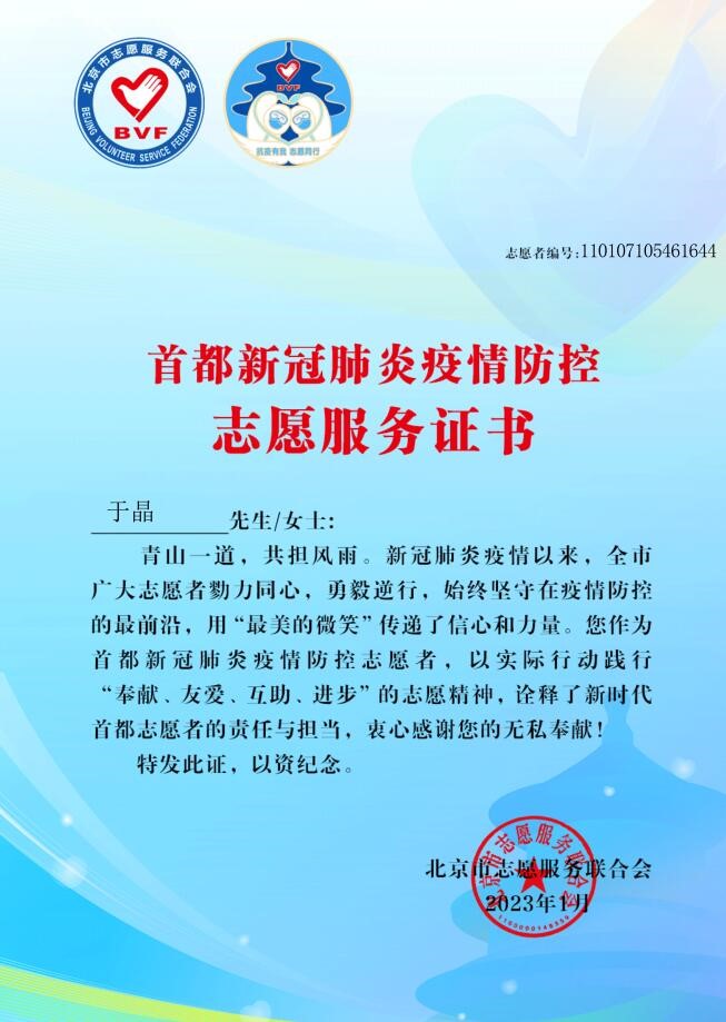 于晶积极参加社区组织的各项公益活动,为社区工作出谋划策。在疫情最严重的时期,她发挥党员示范带头作用,投入到学校及社区疫情防控工作中;她响应“志愿北京”的号召,参加了i志愿大学服务等公益活动,与青少年在线交流,获得“首都新冠肺炎疫情防控志愿服务证书”。