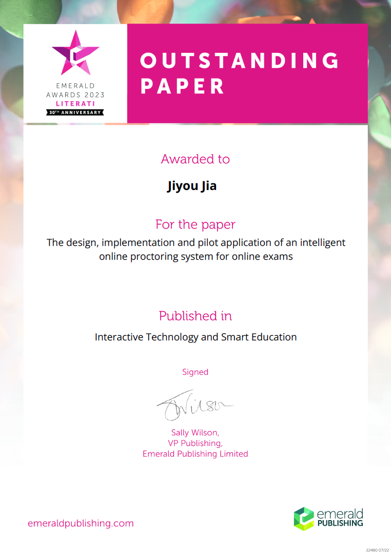 2023年8月31日,英国爱墨瑞得出版社(Emerald Publishing)公布了2023 Emerald Literati Awards for Excellence(研究卓越奖)。MK体育官方网站教育技术系贾积有教授荣获2023年度第三十届Emerald Outstanding Paper Award(杰出论文奖),提升了我院人工智能教育应用和教育技术学方向研究成果的国际影响力。