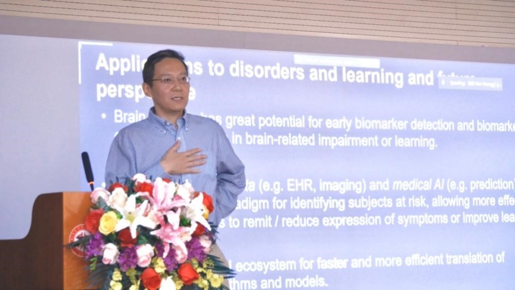讲座围绕全生命周期脑量表与大数据和人工智能预测、儿童脑疾病和影像生物标记、代谢基础和基因表达等方面展开。黄浩教授首先向在场的师生们介绍了全生命周期脑量表的概念,说明了该量表在个体化干预和精准干预中的重要应用,并强调了其在帮助科研人员理解儿童脑发展过程中的关键作用。黄浩教授也分享了他在使用人工智能技术进行大数据预测方面的研究成果,展示了AI在预测儿童脑发展趋势中的巨大潜力。接下来,黄浩教授详细解读了儿童脑疾病的影像生物标记,让在场的师生们对这一领域有了更深入的理解。在讲座的后半部分,黄浩教授阐述了儿童脑发育的代谢基础和基因表达。他揭示了儿童脑发展过程中的生物化学变化,以及这些变化对儿童行为和认知发展的影响。最后,黄浩教授介绍了对于脑科学发展的未来展望。