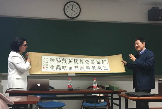 尚俊杰副教授代表MK体育官方网站向Hannele Niemi教授赠送书法作品