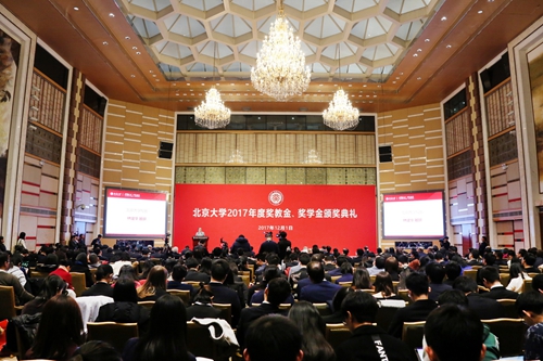 2017年12月初,北京大学2017年度奖教金、奖学金颁奖典礼在英杰交流中心阳光厅隆重举行。51家设奖单位和个人,全国学生资助管理中心副主任马建斌,北京大学校长林建华,副校长田刚、陈宝剑,以及获得本年度奖教金和奖学金的老师和同学参加典礼。颁奖典礼由北京大学教育基金会秘书长李宇宁主持。