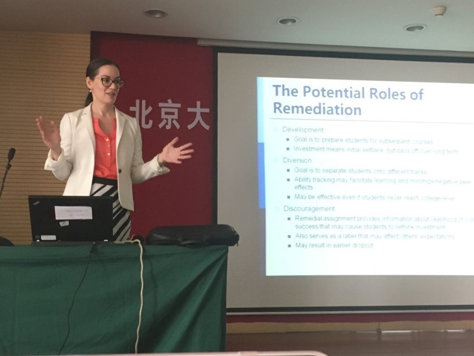 2018年4月,哥伦比亚大学教育经济系Scott-Clayton副教授应邀在我院开展三场讲座,题为《美国学生资助的政策经验回顾》、《助学金项目与学业成绩要求》、《美国大学生补救和发展教育》。该讲座由北京大学“百人计划”研究员哈巍主持,教育学院师生积极参与本次系列讲座活动,教育部相关人员及兄弟院校师生也参与其中。