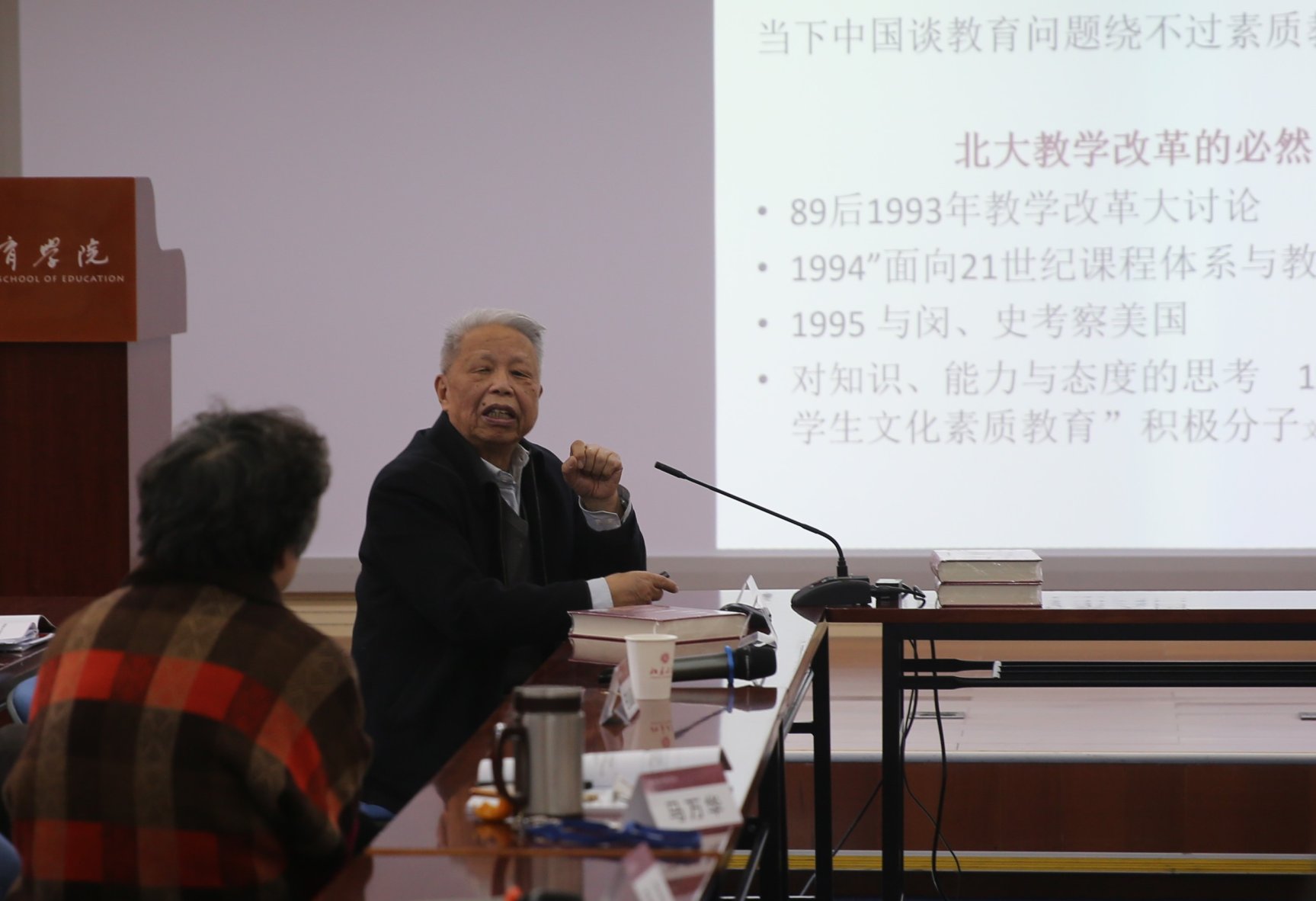在随后的特邀报告环节,北京大学原常务副校长王义遒教授做题为《对“素质教育”的再认识与对“发展素质教育”的再思考》的报告。他结合自身经历和体会,梳理了“素质教育”概念提出的背景、党和国家在不同历史时期的决定和法律法规中对素质教育的表述、素质教育与“应试教育”及专业教育之间的区别等问题。他指出,素质教育需要发展,并且要使理论科学化;教育教学方式丰富多样,要避免单一化;不但要有教育观念和理念,还要形成制度和模式。多位与会老师踊跃发言,就素质教育的相关问题和王义遒教授进行了深入热烈的交流。王义遒教授还向教育学院图书馆捐赠了他出版的新书《探索新型综合大学--王义逎教育文选》。