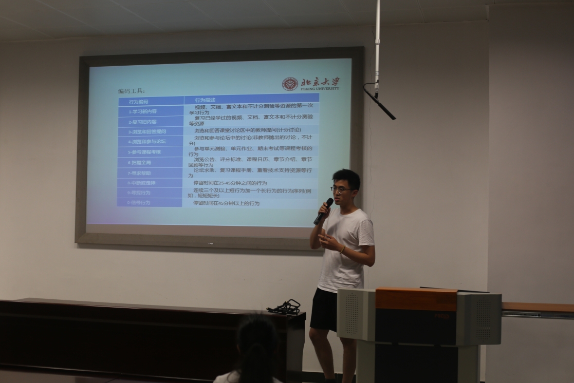 在子会议“学习分析、评估、人工智慧教育应用”中,17级硕士欧阳嘉煜作了《慕课情境下同伴互评评语质量的分析研究》的报告,指出同伴互评作为一种协作式学习活动,主要涉及到评价者、被评价者和评语三个关键要素。该文通过深入分析教师培训类慕课“教师如何做研究”1-11期的数据,发现同伴互评活动中存在评语字数过少、评语内容重复和忽视评价量规三大特点,且评语字数与学员成绩存在显著正相关。